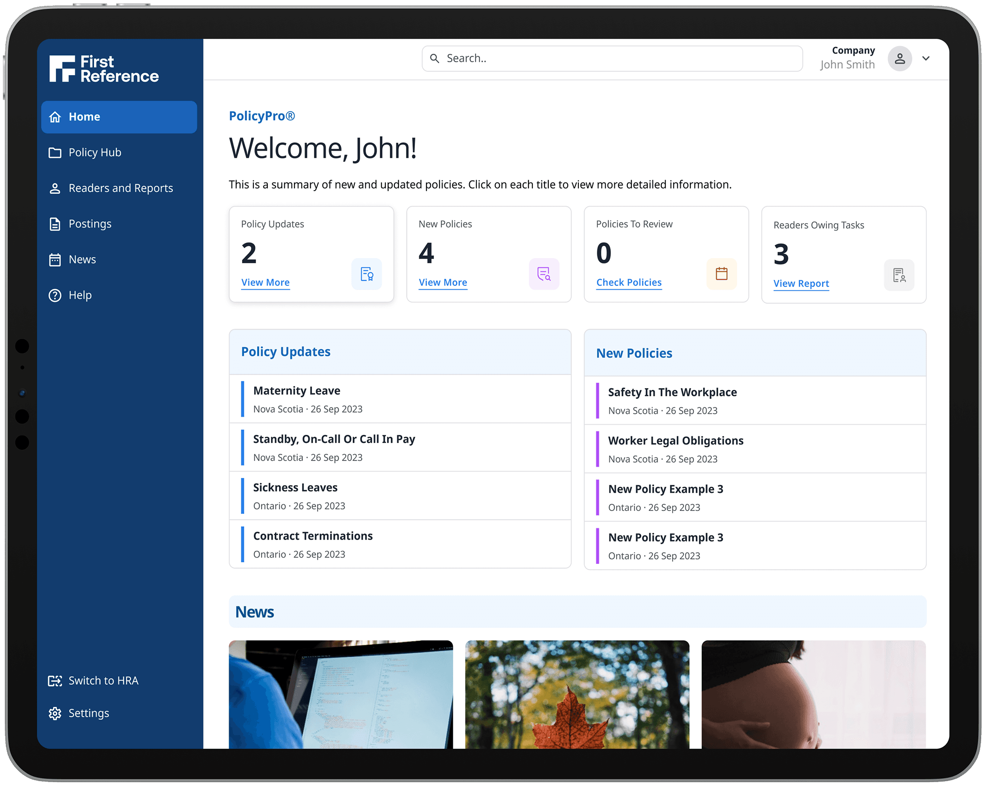 It highlights new and updated policies, pending reviews, and tasks.