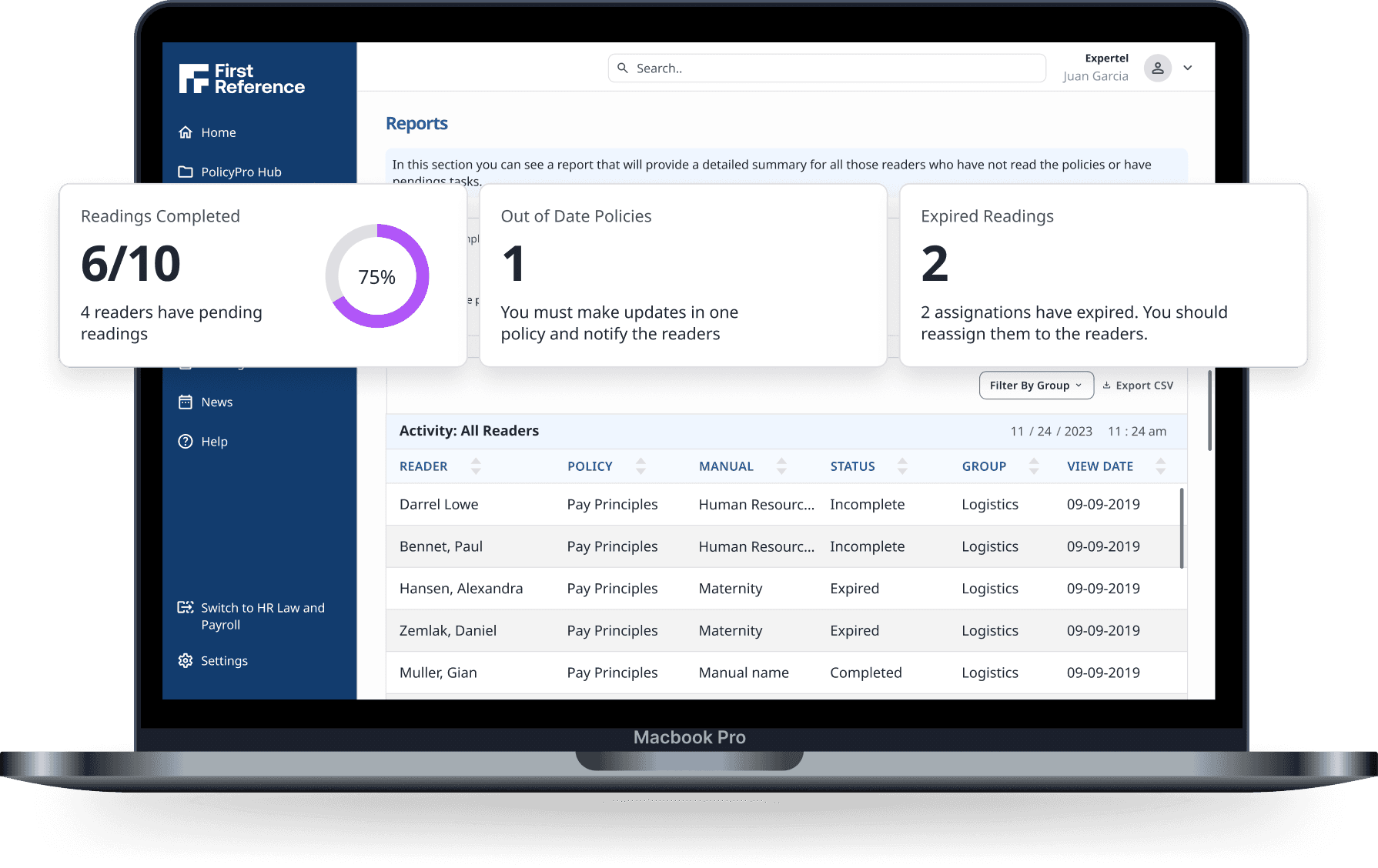 View detailed activity by reader, policy, and completion status, and use our charts to explore your team’s engagement within PolicyPro.